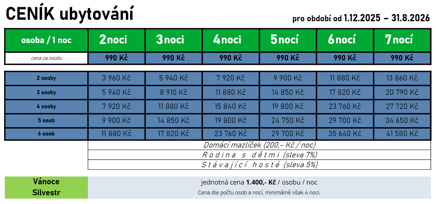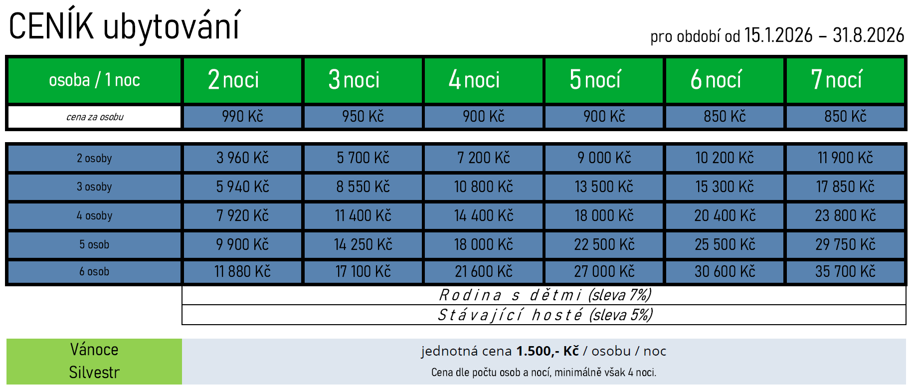 LETNÍ SEZÓNA - preferujeme týdenní pobyty od soboty do soboty!